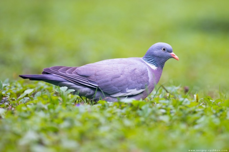 Надхвостье голубя белое, а самцы имеют металлический фиолетово-зеленый перелив.