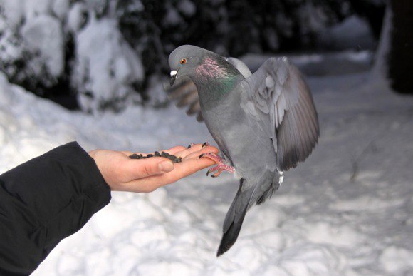 Проживающие в городе голуби, как правило, вынуждены питаться тем, что дают люди, или тем, что удастся найти на помойке. В теплое время года птицы еще способны раздобыть себе пропитание, но естественного корма в городе очень мало. Ведь в населенных пунктах регулярно подстригается трава на газонах и обрезаются верхушки кустарников и деревьев.