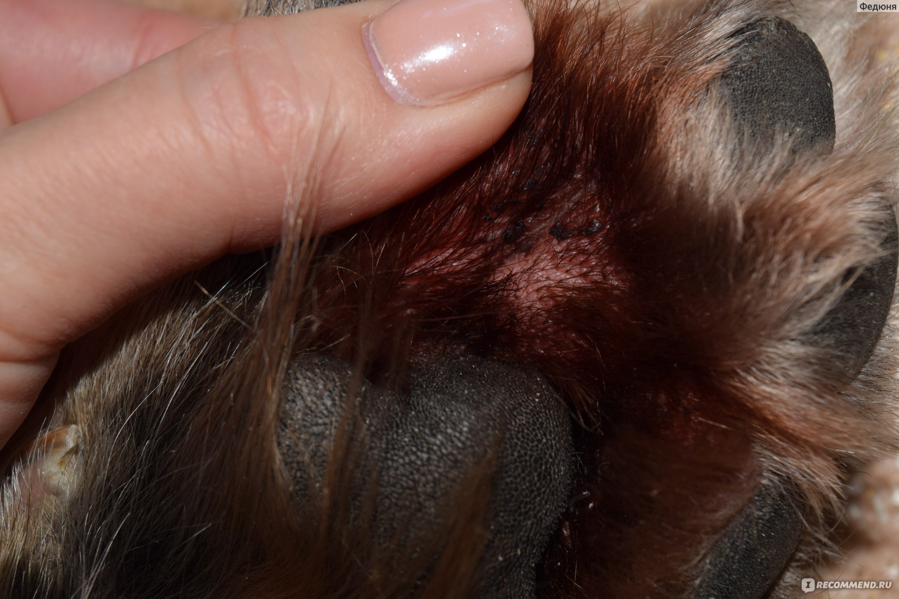 - Возможно небольшое шелушение. Поражения чаще всего расположены на лапах, морде, особенно вокруг ушей, глаз или в уголках рта