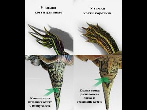 Как правило, у мужских особей передние когти более прочные и длинные, чем у женских. Зрительно это достаточно легко определить, потому что различие длины когтей самцов и самок довольно значительное. Длинные когти помогают самцу удерживать самку во время спаривания.