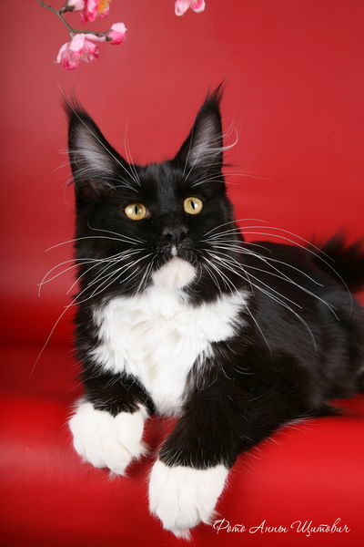 Среди столь популярных в настоящее время крупных мейн-кунов также встречаются представители с черно-белым окрасом, в основном, относящиеся к типу биколор, большая часть корпуса которых покрыта темным цветом, включая уши и морду.