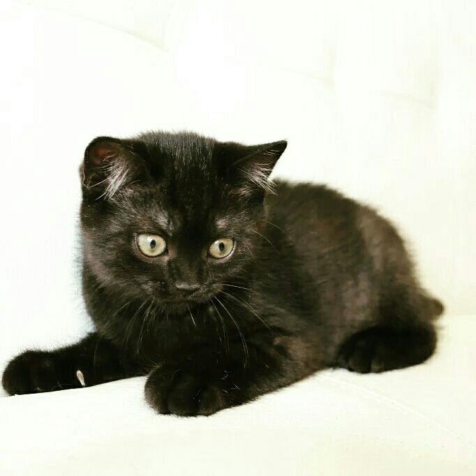 Поговорим о прекрасном солидном однотонном черном окрасе. В народе бытует суеверие про чёрных котов. Это очень прискорбно, поскольку британский, либо шотландский вислоухий, прямоухий черный кот, дружелюбны, общительны, чарующе-таинственны, изящны, имеют ласковый характер.