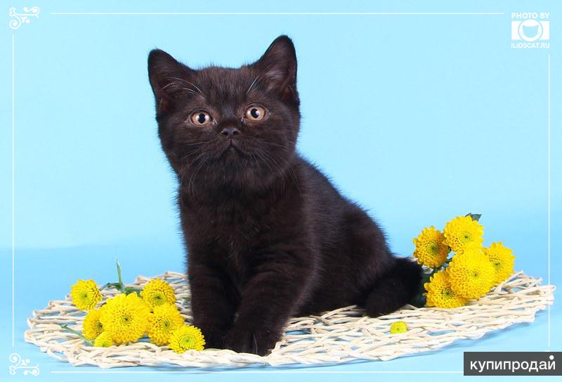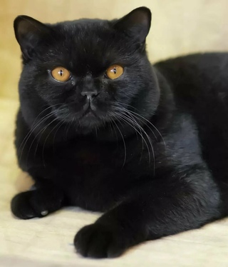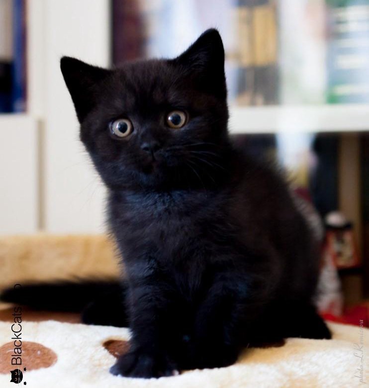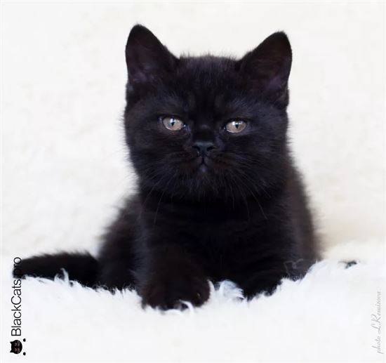 .. Она черна, «черна до невозможного». У неё блестящие чёрные бакенбарды, чёрные ресницы, ни одного белого волоска. Если серую кошку создавал мастер утончённости, любитель нюансов, то творец чёрной решил: пусть будет кошка чёрная-чёрная, ну просто квинтэссенция черноты…». Черные кошки с оранжевыми глазами — это всегда красиво, тем более в сочетании с плюшевой набивной породной шубой «британцев». Но занимаются черным окрасом далеко не многие питомники. Это связано с тем, что получить ровномерный, красивый прокрас каждой шерстинки от корня до самого кончика достаточно сложно. Недопустимо присутствие «ржавчины», белых пятен, волосков или серого подшёрстка. Белые волоски допустимы только в детском возрасте, и постепенно они заменяются на черные. Мочка носа у чёрных британских кошек обязательно чёрная. Подушечки лап чёрного или коричневого цвета. Цвет глаз — оранжевый.