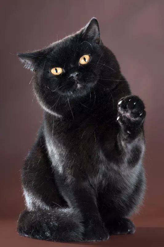 Забавный черный кот. красивый пушистый британец с желтыми глазами.