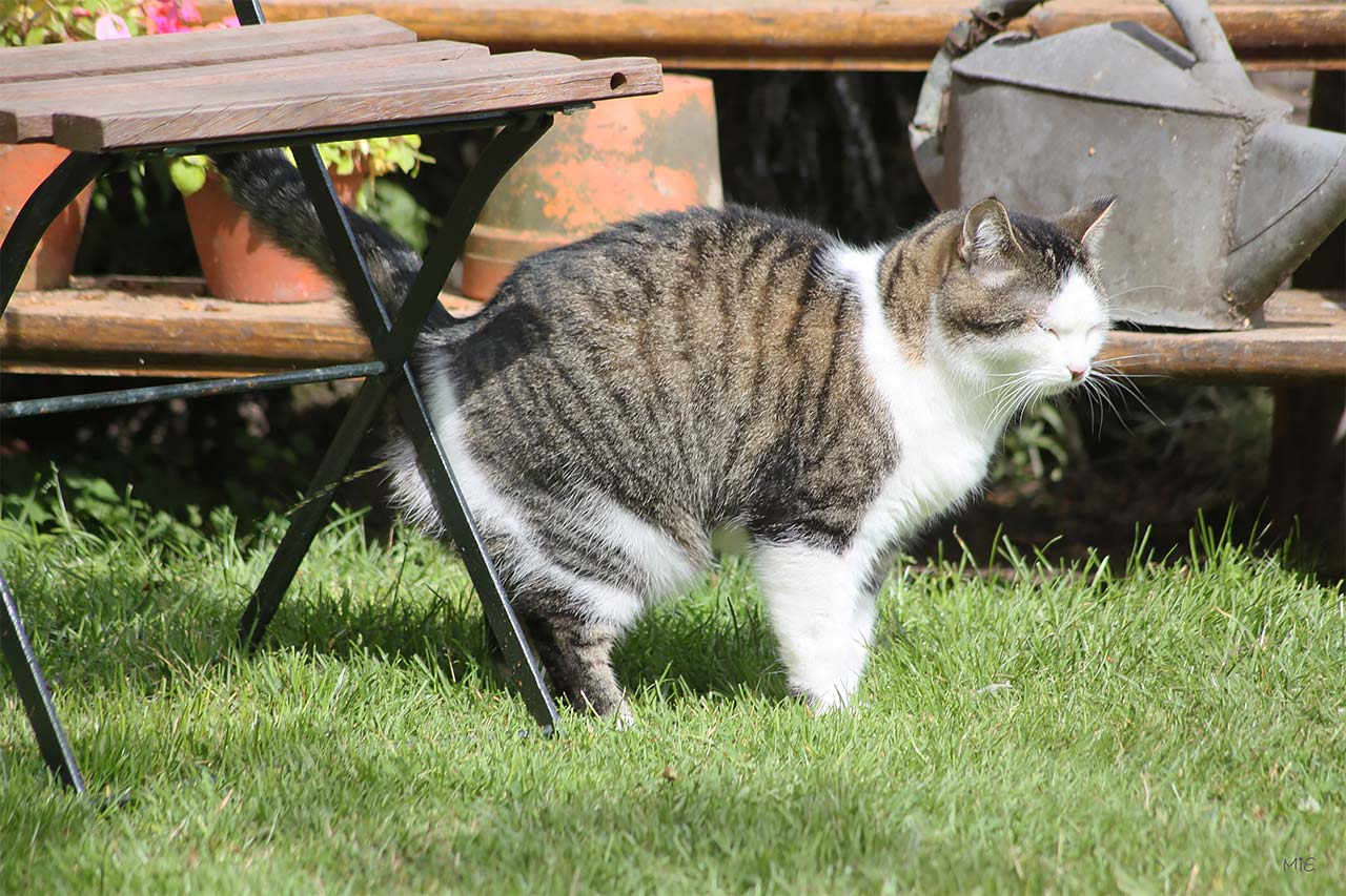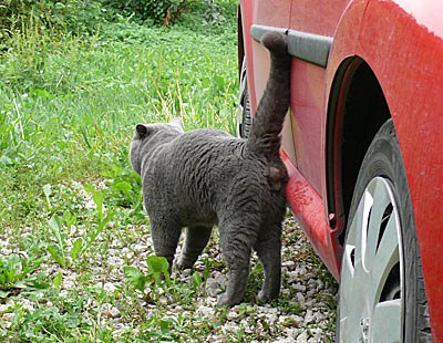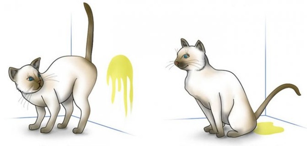 Кошки мочатся, присаживаясь на горизонтальную поверхность. Когда же они метят территорию, то делают это стоя. Кошка совершает поступательные движения задними лапами, а ее хвост подрагивает, и при этом моча маленькими порциями разбрызгивается по вертикальной поверхности, оставляя запаховую метку