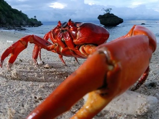 Его зеленый панцирь достигает восьми сантиметров. Встречаясь с хищником, он не особо полагается на свои клешни, а мгновенно убегает. А вот бегает он очень проворно, хоть и боком. Его скорость достигает до одного метра в секунду.