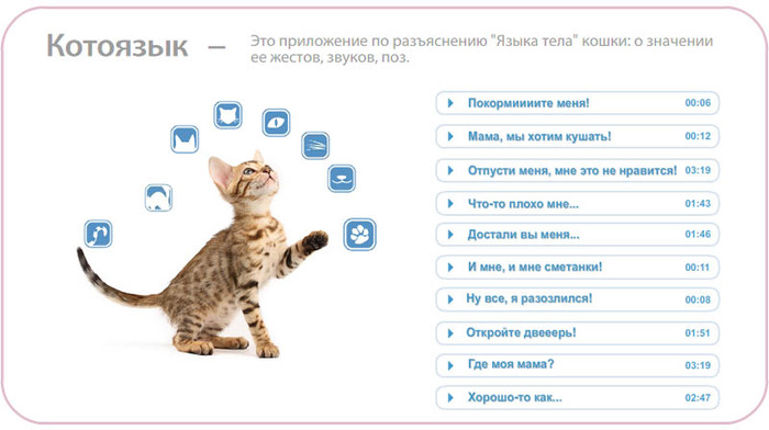 Разумеется, кошки не разговаривают в истинном смысле этого слова. Они не знают слов. Но звуки, произносимые ими, носят отнюдь не произвольный характер. Для кошек характерна мелодика, состав которой варьируется. Человек интерпретирует соответствующие мелодии и на удивление часто попадает в точку.