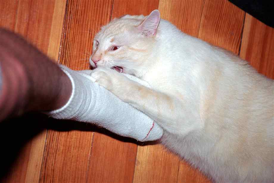- Во время игры. Играя, кошки часто начинают кусаться и царапаться. Главный совет владельцу, чтобы отучить питомца от укусов и царапин – это не подставлять ему руки и ноги для игр, а использовать для игрового процесса специальные приспособления – игрушки, мячики, шарики и так далее.