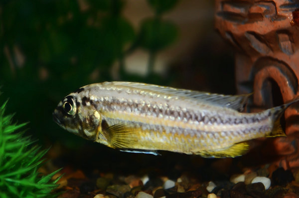 Melanochromis auratus) или золотой попугай это одна из драчливых цихлид озера Малави. Что характерно для ауратусов — самка и самец имеют противоположную окраску, самцы темное тело с желтыми и голубыми полосами, а самки желтые с темными полосами.Такая окраска облегчает жизнь аквариумистам, так как ясно видно где кто и можно избежать драк между самцами.