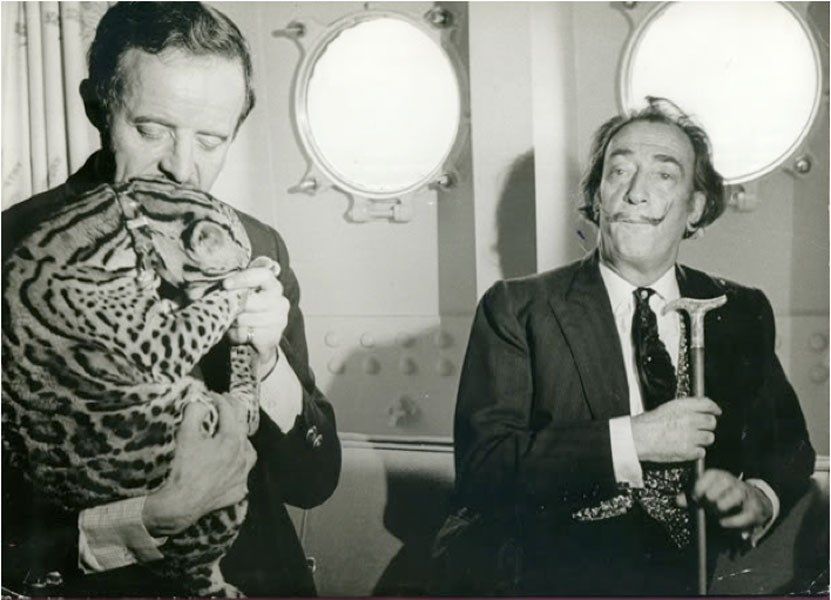 Хорошо заметно, что на снимках Дали с его «любимым оцелотом Бабу» напряжены и художник и котик. А вот настоящий хозяин оцелота Питер Мур (справа) действительно был привязан к своему питомцу.