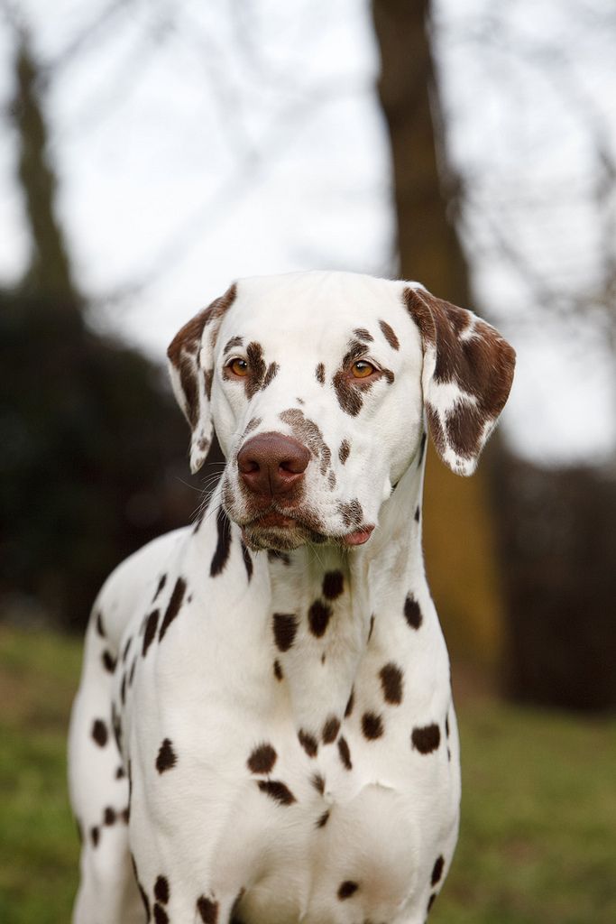 Далматин с коричневыми пятнами смотрится очень элегантно. Его окрас не столь контрастен и более мягок. Такой далматин всегда привлекает к себе внимание зрителей и экспертов на выставках, и просто прохожих на улице. Коричневый цвет пятен и мочки носа говорит о благородстве происхождения, так как не встречается в дикой природе.