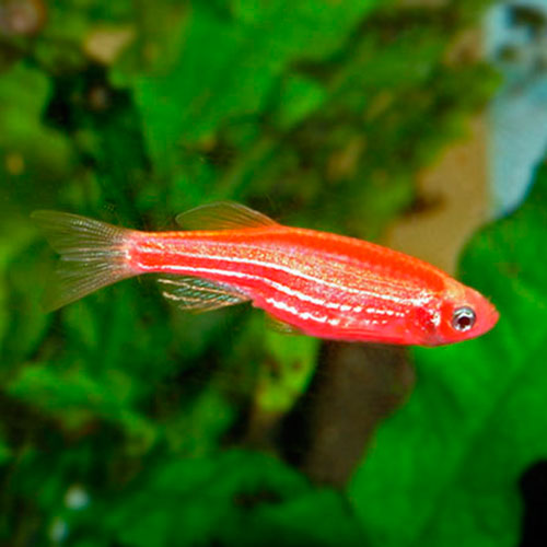Данио розовый (Brachydanio albolineatus) имеет оригинальный коралловый окрас. Вдоль тела идут белые полосы, такие же полосы имеются и на бесцветных плавниках. Рыбка выведена искусственно и в природных условиях не такая красочная.