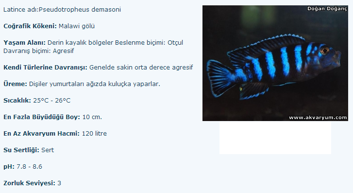 Псевдотрофеус Демасони, научное наименование Pseudotropheus demasoni, принадлежит семейству Cichlidae. Относительно новый в аквариумистике вид, стал доступен в продаже только с 1994 года. Но за это время стал популярным среди коллекционеров малавийских цихлид и специалистов. Не рекомендуется начинающим аквариумистам ввиду проблем с совместимостью с другими рыбами.