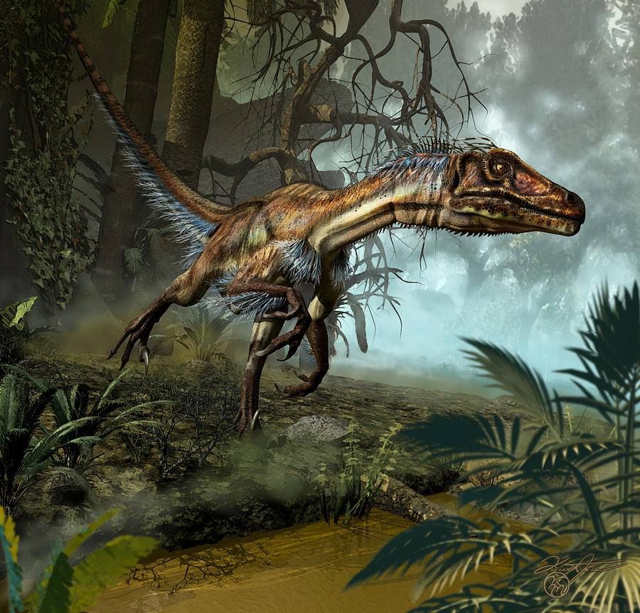 Микрораптор, например, был крошечным хищником, который весил около двух фунтов и был достаточно маленьким, чтобы поместиться в руках взрослого человека. На ногах у него были маховые перья, которые помогали ему скользить с ветки на ветку.
