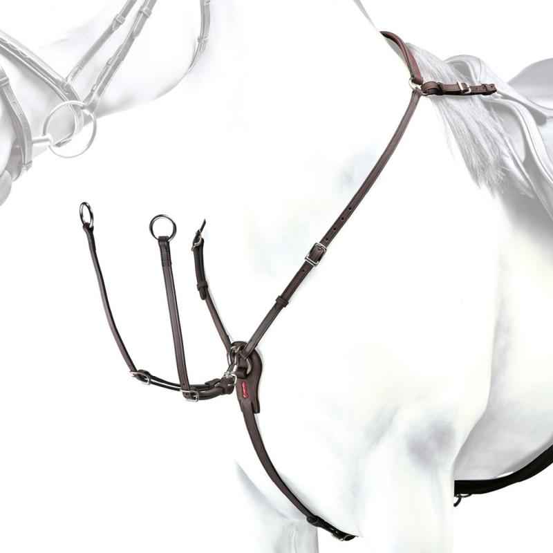 Регулируя пряжку на широкой части мартингала, добейтесь, чтобы при натянутом поводе мартингал немного провисал. При более строгой подгонке мартингал приучает лошадь к постоянной борьбе с руками всадника, это грозит постоянными выдергиваниями головы вверх.