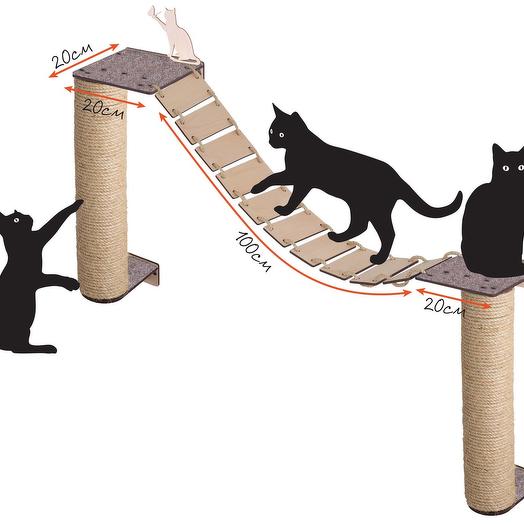 Когтеточки представляют вертикальные поверхности, обмотанные веревками из натуральных компонентов, а лазалки – это горизонтальные и наклонные поверхности, предназначенные для того, чтобы животное могло перемещаться между различными уровнями комплекса. Кстати, когтеточки так же используются животными, чтобы забраться на верхние ярусы или площадки.