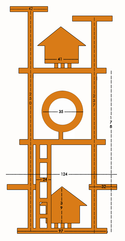 За основу берется конструкция, состоящая из 3-х столбов различной высоты: 220 см, 120 см и 80 см. Столбы надежно крепятся к основе, которую представляет фанерный лист. Эти несущие элементы размещаются таким образом, чтобы самый длинный находился как можно ближе к стене, чтобы надежно закрепить всю конструкцию.
