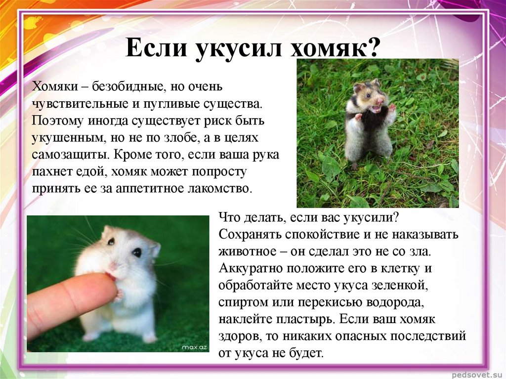 Не паникуйте и не переусердствуйте. Помните, что это естественная реакция, и она не означает никакого вреда. Ничего личного! Не кричите, не роняйте хомяка и не пытайтесь его как-либо наказать. Это не работает, и ваш питомец с большей вероятностью укусит вас снова.