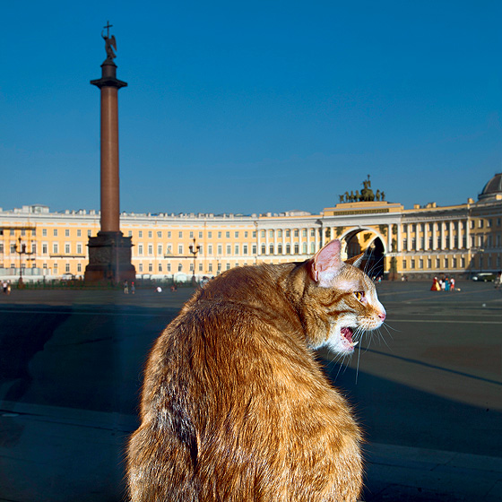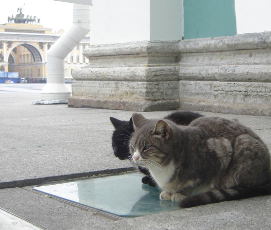 Дворцовая площадь. Зимний дворец. Возле начала улицы Миллионной, за чугунными воротами на мостовой валяются с десяток котов в ошейниках и получают ультрафиолет. На «кис-кис» вполне могут ответить взглядом типа «Ты кто вообще такой?» Это очень важные коты. Cамые-самые важные и крутые коты в России.