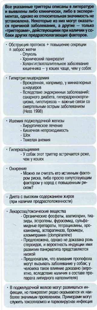 2,3 У собак с хроническим панкреатитом вначале может быть клинически тяжелый, по-видимому, острый эпизод панкреатита после того, как субклиническая фаза вялотекущего воспаления разрушила ткань поджелудочной железы. 4 Хронический панкреатит в некоторых случаях может быть случайной находкой. 5