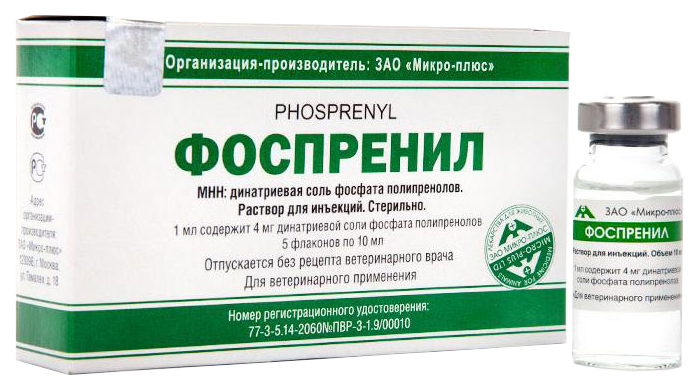 - Возможно применение фоспренила внутрь собак и кошек, при этом следует использовать разовую дозу, удвоенную по отношению к внутримышечной дозе. При лечении вирусных заболеваний телят разовая внутримышечная доза фоспренила составляет 0,1 мл на 1 кг массы тела.