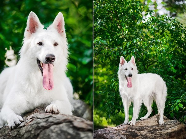 Натуральная блондинка, белая швейцарская овчарка (White Shepherd) по своей стати и характеру очень схожа с немецкой овчаркой (размер и длина задних и передних лап, вес, расположение и размер ушей и т. д.). Только окрас у них разный. Уровень интеллекта у белой швейцарской овчарки схож с теми же параметрами немецкой овчарки, которая, как известно, входит в ТОП самых умных пород в мире. Недаром её активно используют в своей работе, военные, полиция и другие силовые структуры.