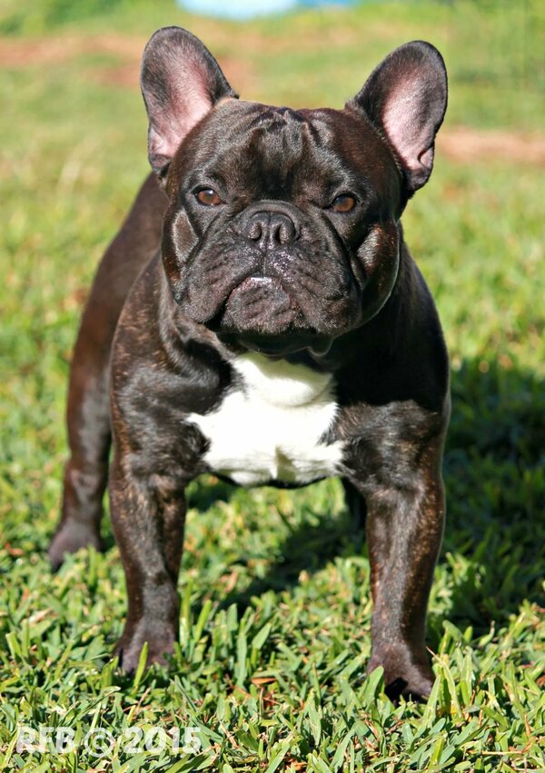 Пятнисто-пестрый французский бульдог — Французская собака с белыми волосами на груди, голове, шее или пальцах ног.