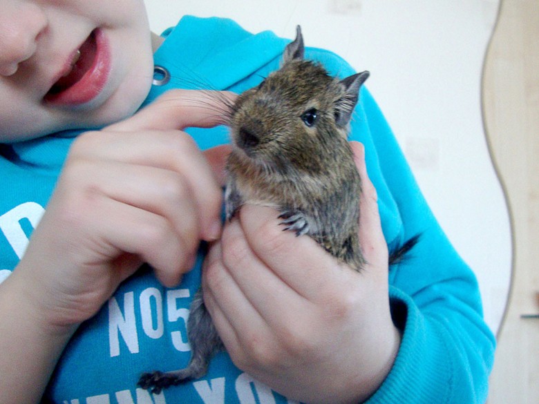 Имейте в виду, что это животное не терпит фамильярности, и если какой-то человек попытается вступить с ним в контакт силой, ответом на такие действия будут укусы довольно острыми зубами. Поверьте, кусают больно, и ощущения, которые вы испытаете, не самые приятные. По этой причине дегу нельзя назвать удачным выбором питомца для маленьких детей.