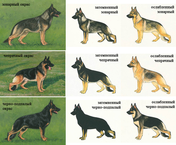 Допускается всяческая комбинация зонарных окрасов. Конечный вариант и образует тип расцветки. Она бывает зонарно-серой (ее еще называют простой серой или волчьей, такая масть чаще всего встречается у овчарок ) и зонарно рыжей.