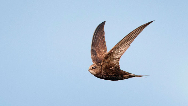 Летящий обыкновенный стриж под голубым небом