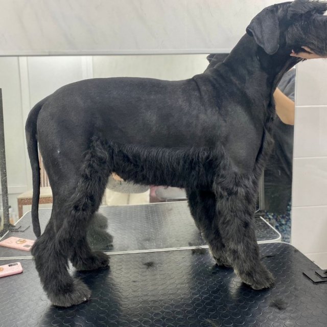 Обязательные процедуры для ризенов — удаление старой шерсти и стрижка машинкой. Первый тримминг проводят в 6 месяцев, как правило, в специализированном салоне.