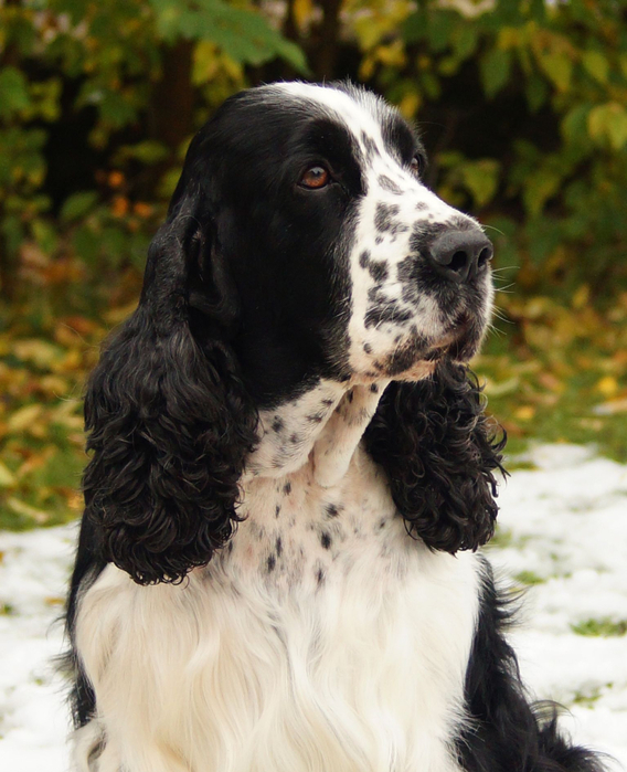 Английский спрингер-спаниель – собака средних размеров, вырастающая до 48-51 см в холке и весящая в пределах 22-24 кг. На пропорциональной, плавно очерченной голове с сухими плоскими скулами и невыраженным затылком имеются миндалевидные глаза и длинные висячие уши. Крепкий корпус с округлыми ребрами и прочной спиной покрыт блестящей гладкой белой шерстью с черными или печеночными отметинами.