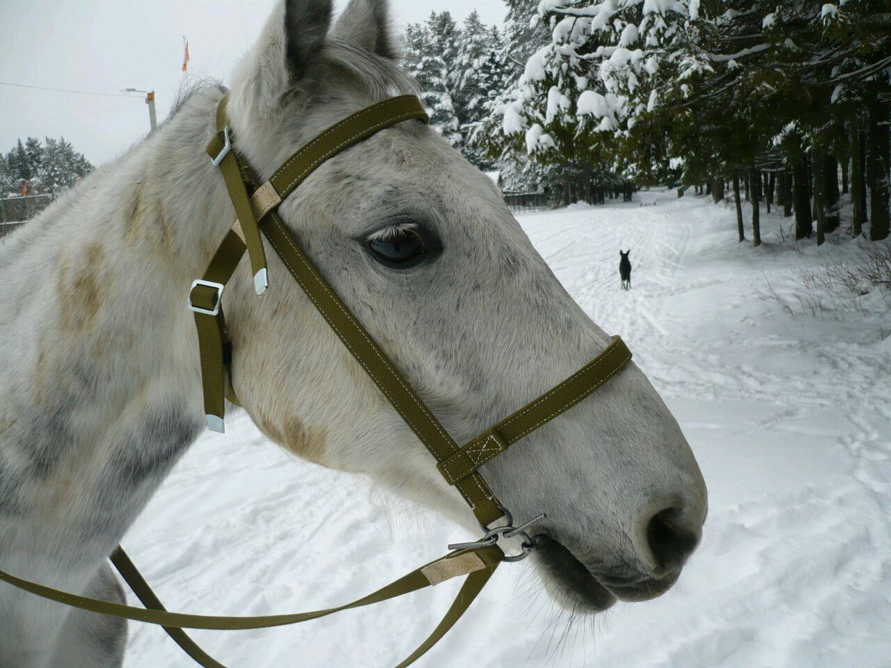 - После этого необходимо стать около левого плеча лошадки и занять то же направление, что и она, фиксируя недоуздок верхней пряжкой.