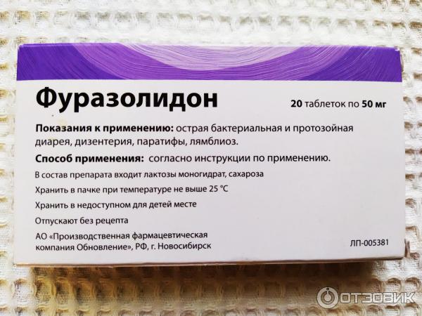 Режим дозированияФуразолидон назначают внутрь. Для лечения паратифа, дизентерии, пищевых токсикоинфекций взрослые принимают по 0.1-0.15 г после еды 4 раза/сут на протяжении 5-10 дней (продолжительность приема зависит от характера и тяжести патологического процесса). Дозы для детей — 10 мг/кг массы тела в сутки (суточную дозу распределяют на 3-4 приема). Фуразолидон не рекомендуется назначать более 10 дней. При лечении лямблиоза взрослые принимают по 0.1 г фуразолидона 4 раза в день, дети — в дозе 10 мг/кг массы тела в сутки (суточную дозу распределяют на 3-4 приема). Высшие суточные дозы для взрослых для приема внутрь: разовая — 0.2 г, суточная — 0.8 г. Побочное действиеВозможно появление тошноты, рвоты, снижение аппетита; в отдельных случаях могут развиться аллергические реакции. Для уменьшения побочных реакций при применении фуразолидона рекомендуется принимать его перед едой и запивать препарат большим количеством жидкости, при необходимости уменьшить дозу, назначить антигистаминные препараты и витамины группы В. При выраженных побочных явлениях необходимо прекратить применение препарата. Противопоказания к применению