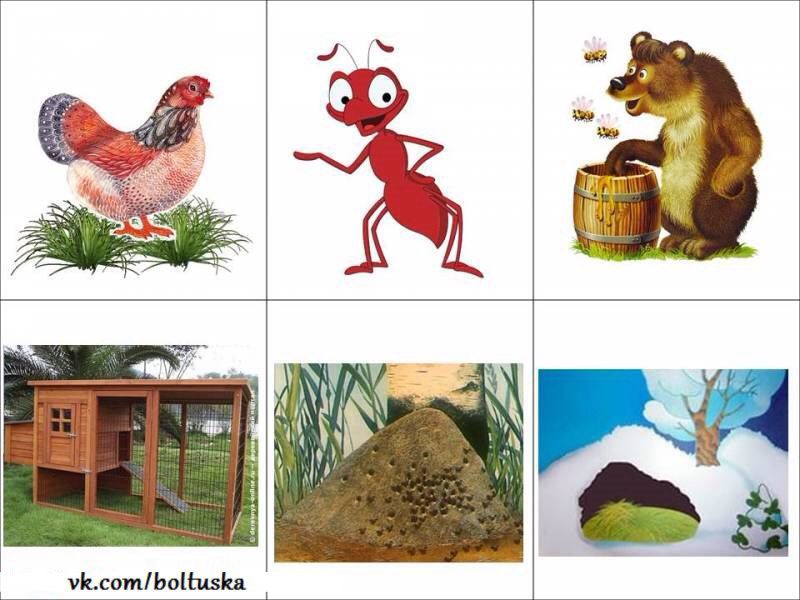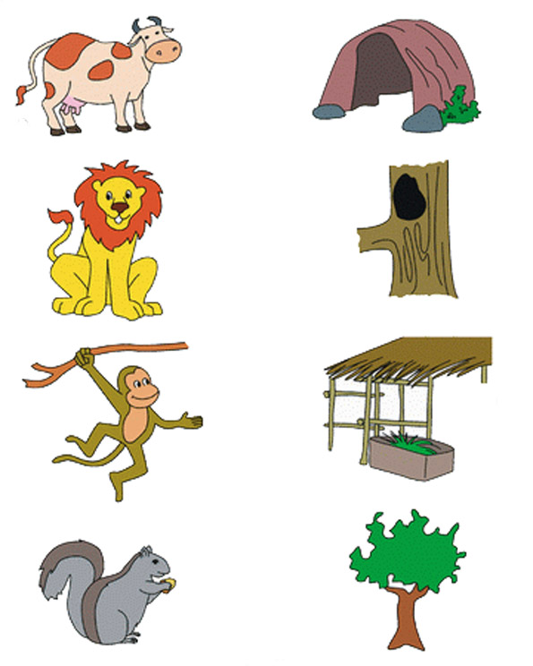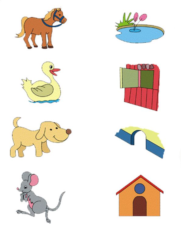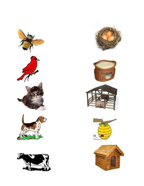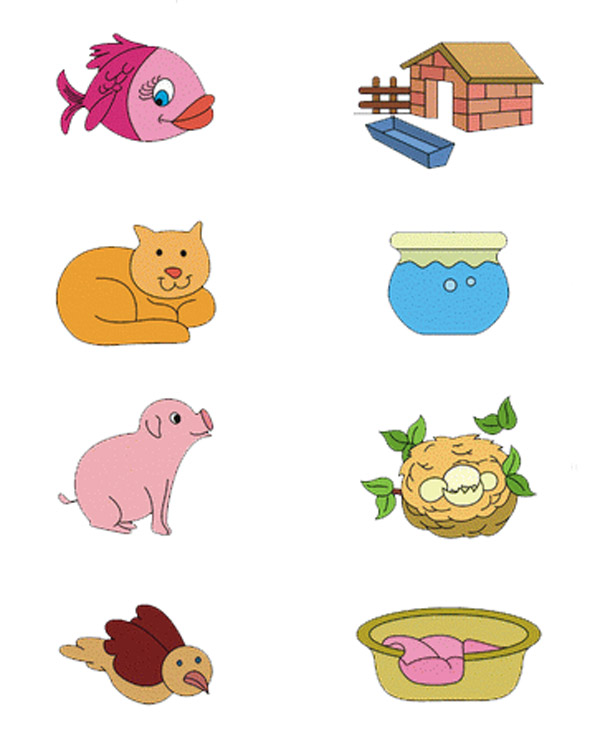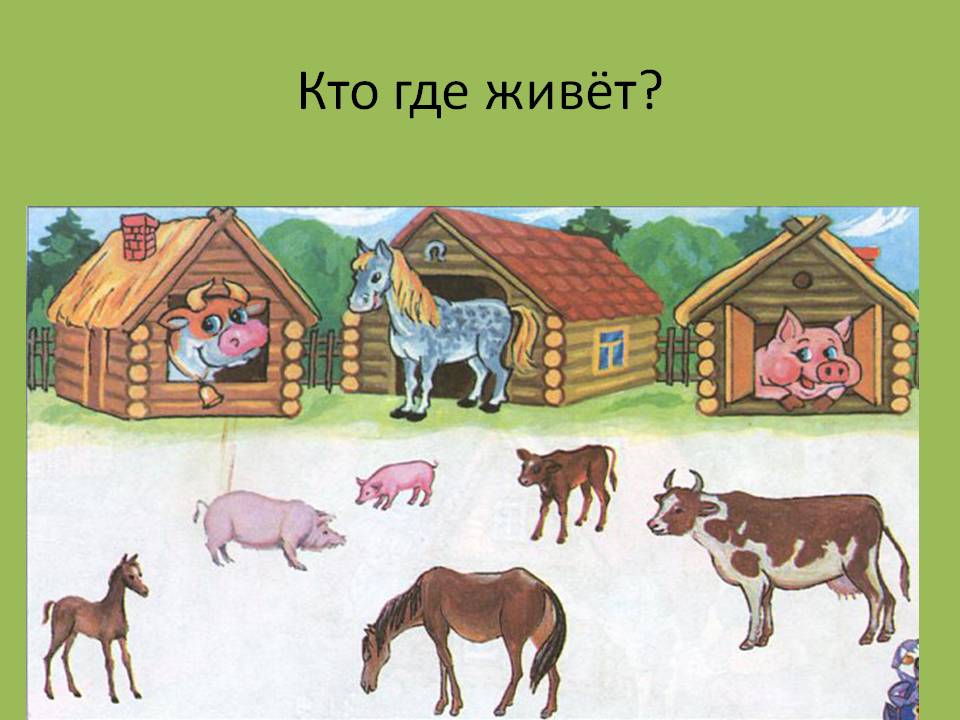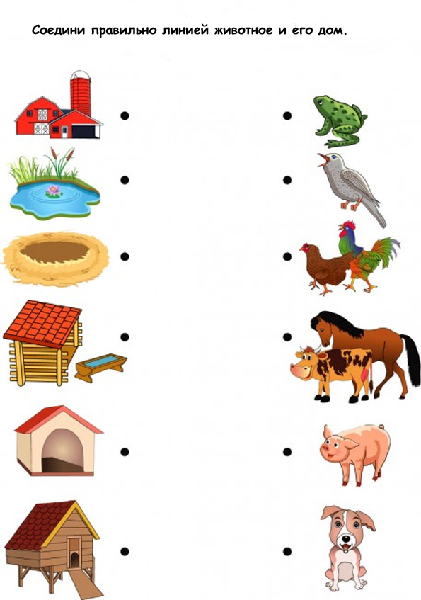 Игра «Кто где живет?». Педагог показывает картинки, называет домик для животного (будка, хлев, курятник, дом) и спрашивает у детей о том, кто в этом домике живет. Затем предлагает соединить рисунок животного (кот, собака, курица, корова) с домиком, в котором оно живет.