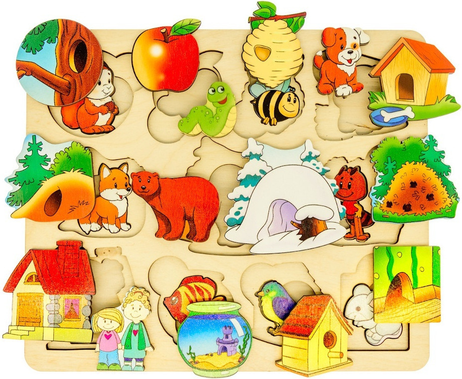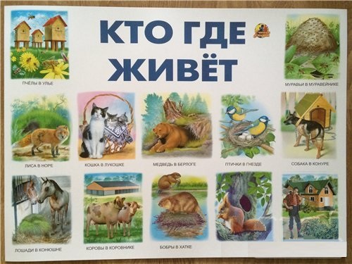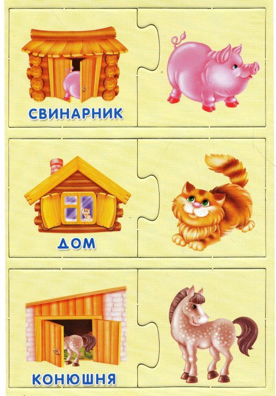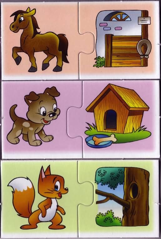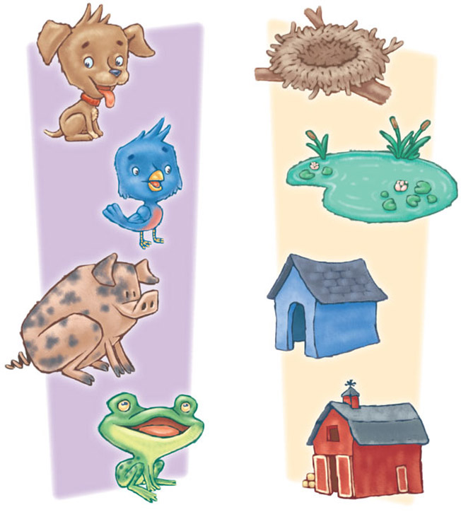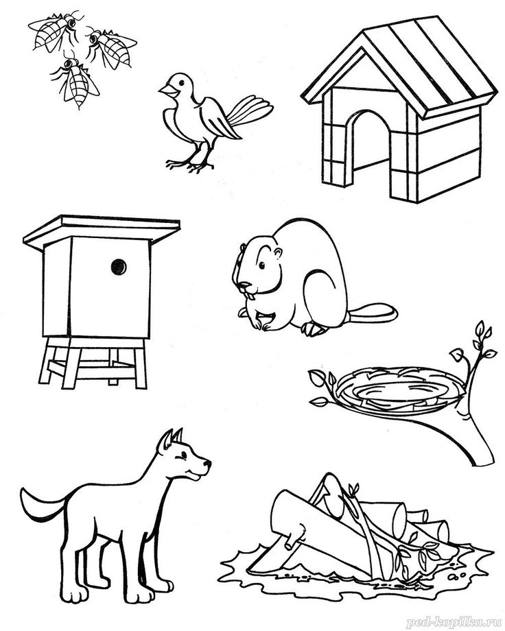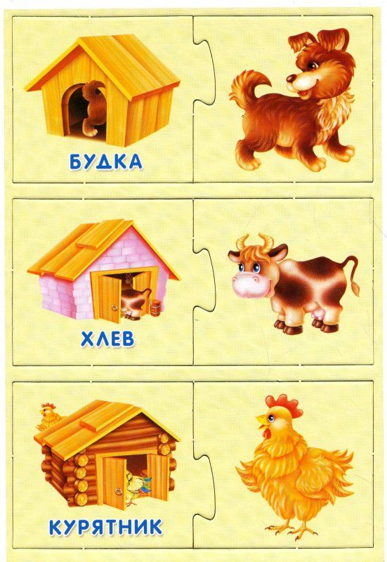 Игра «Кто где живет?». Педагог показывает картинки, называет домик для животного (будка, хлев, курятник, дом) и спрашивает у детей о том, кто в этом домике живет. Затем предлагает соединить рисунок животного (кот, собака, курица, корова) с домиком, в котором оно живет.