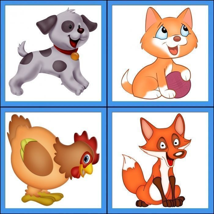 Сначала звучит голос животного, дети отгадывают, какое это животное, педагог демонстрирует картинку с изображением животного (кот, собака, курица, корова). Можно предложить детям подражать звукам животных, которые представлены на картинках.