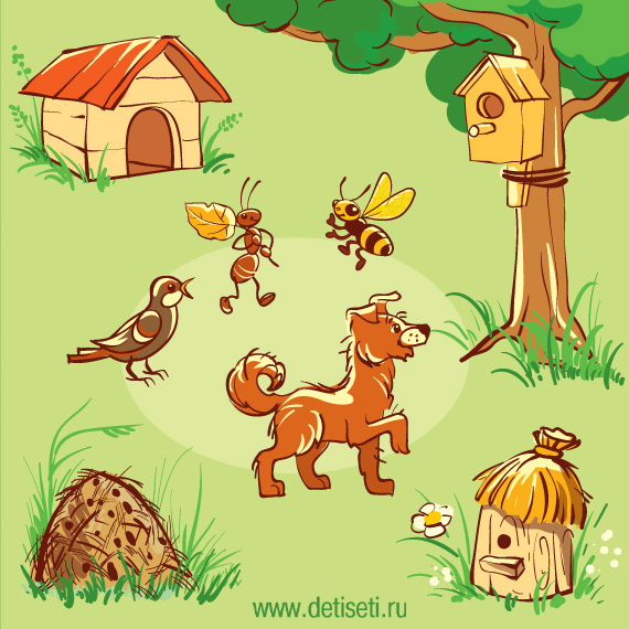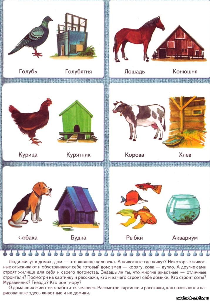 Педагог. Как хорошо, когда у животных есть свой домик, в котором они могут прятаться от дождя, холода. А как люди еще заботятся о домашних животных? (Ответы детей.)