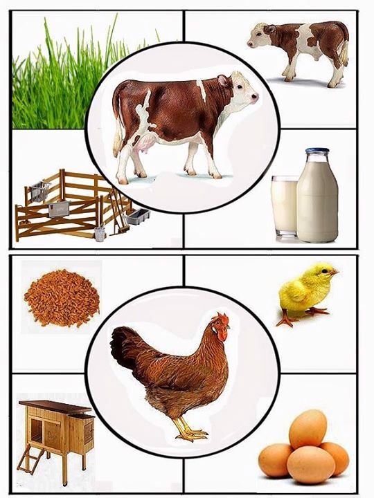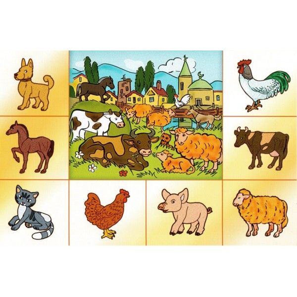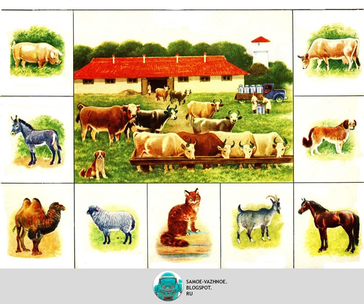 Существительные: Животные, корова, теленок, коза, козел, баран, овца, ягненок, конь, лошадь, жеребенок, кошка, кот, собака, пес, щенок, верблюд, осел, олень, свинья, кабан. Поросенок, хлев, хозяйка, хозяин, свинарка, доярка, конюх, грива, вымя, копыта, рога, хвост, морда.