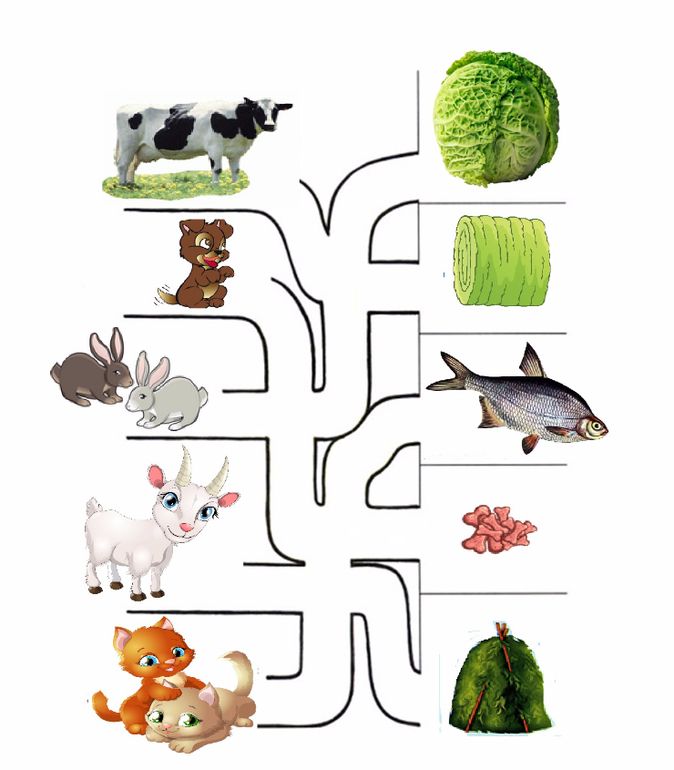 После ответов детей педагог предлагает детям соединить линией рисунок животного с его кормом.