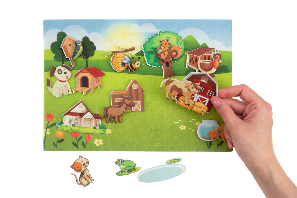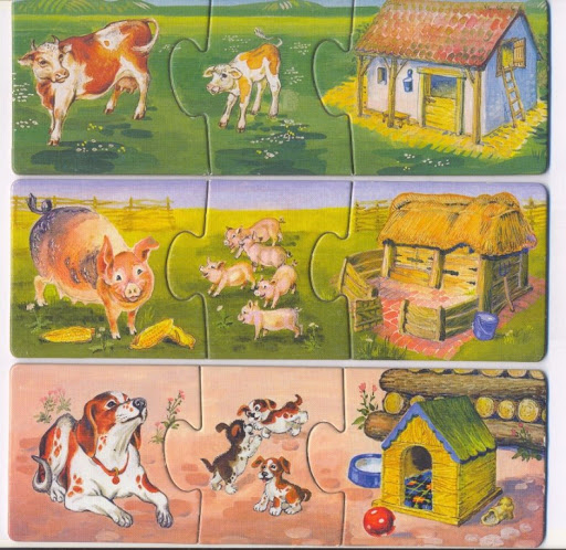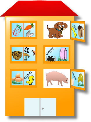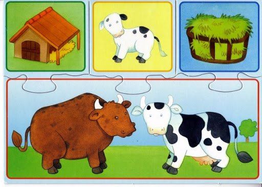 · Рассматривание дидактических картинок с изображением животных (кот, собака, курица, корова, лиса, заяц), корма для животных (зеленая травка, пшено, молоко в мисочке, косточка), будки, хлева, курятника, дома;