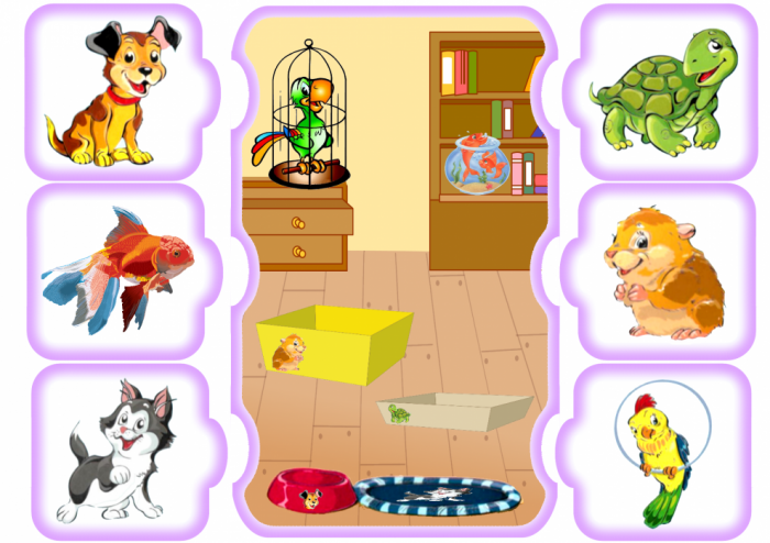 Задачи: формировать представление о роли домашних животных в жизни человека; продолжать формировать представление о домашних животных; уточнять представление о потребностях домашних животных в жилье и пище; продолжать развивать зрительное и слуховое восприятие детей; расширять словарный запас по теме «Домашние животные»; формировать заботливое отношение к домашним животным; формировать интерес к животным, их жизни.
