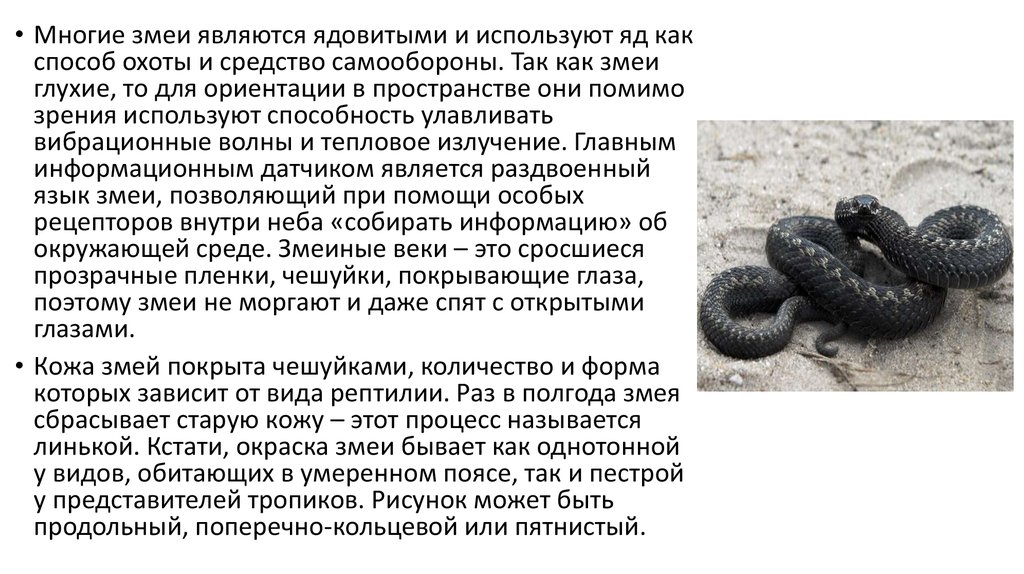 — 10 м. И те и другие питаются только живой добычей, но далеко не такой крупной, как иногда принято считать; самое большое животное, какое может проглотить огромный питон или удав – это овца, свинья или небольшая антилопа, но никак не лошадь, корова или взрослый человек. Добычу свою эти змеи убивают, обвивая кольцами тела и быстро и осторожно сжимая. Такое поведение свойственно этим рептилиям только во время охоты. Если же змея сама подверглась нападению со стороны какого-то другого хищника (или ее пытается поймать человек), то она не набрасывает свои удавливающие петли, а лишь ожесточенно кусается и раны наносит весьма серьезные. Удавы рождают живых детенышей, а питоны откладывают яйца, причем самка питона «насиживает» их! В отдельной биогруппе показано как самка тигрового питона выводит потомство. Она сворачивается в три-четыре кольца вокруг кладки, образуя живой конус, завершаемый головой, лежащей поверх. Таким способом она не только охраняет будущее потомство от хищников, но и согревает его. Установлено, что температура тела самки на 67 градусов выше, чем у самца, и на 1012 , чем в воздухе. В Юго- Восточной Азии мелких питонов иногда держат вместо кошек, они превосходно очищают дома от мышей и крыс, и имеют спокойный уживчивый характер. Более половины всех змей, живущих на Земле, относится к ужам. Они распространены на всех материках и островах. Самый известный среди них – обыкновенный уж, в России он встречается почти повсеместно по берегам озер, прудов, болот, иногда в садах и огородах. Так же широко распространена и обыкновенная медянка, ее часто путают с безногой ящерицей веретеницей из-за сходной окраски, считают ядовитой, но и то и другое животное абсолютно безобидны. Не менее известна эскулапова змея, изображение которой над чашей еще с античных времен стало эмблемой медицины. Многие любители содержат этих змей в неволе, а в Германии и в Австрии организованы даже специальные «змеиные парки». Большинство людей полагают, что ужи – змеи неядовитые, но следует заметить, что слюна у многих ужей содержит ядовитые вещества, а некоторые имеют специальные железы, вырабатывающие яд, и зубы, впрыскивающие его в ранку при укусе. Но яд этот опасен, как правило, только для добычи – различных мелких животных. Особого внимания заслуживает стрела-змея. Свое название она получила за необыкновенную стремительность движений и за то, что взятая в руки, она напрягает мышцы и становится на ощупь твердой, как металлический стержень. И, наконец, по-настоящему ядовитые змеи: аспиды, гадюки, морские змеи