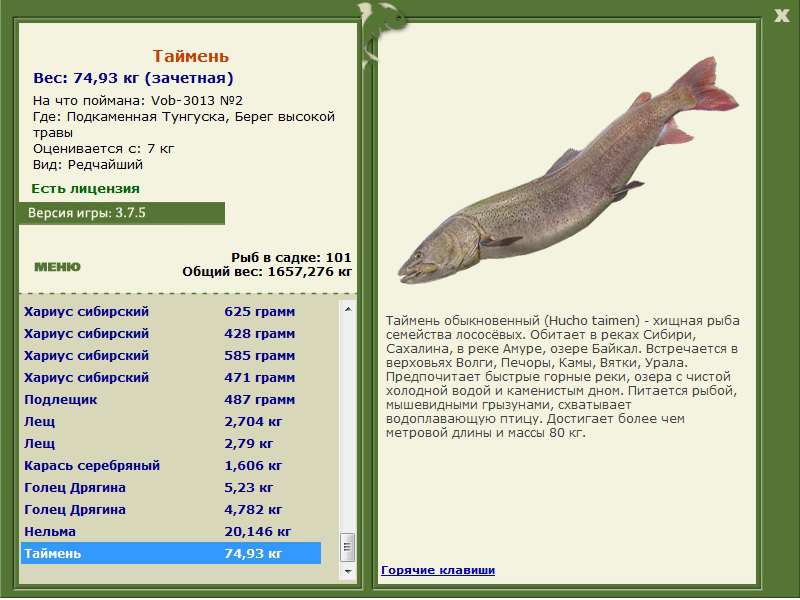 Немногие виды рыб могут претендовать на звание хозяина реки. В силу своих физических качеств, размеров и красоты, таймень (в латинской транскрипции Hucho taimen) по праву носит этот титул. Ареал обитания тайменя составляют, в основном, труднодоступные места, что делает его желанным рыболовным трофеем.