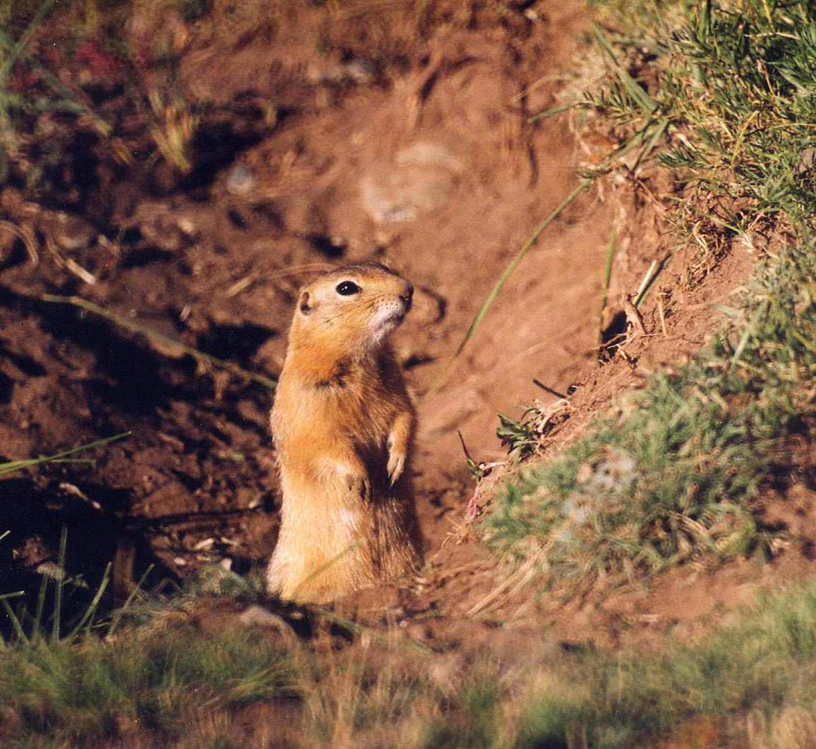 Ископаемый (роющий) суслик — редко встречающееся животное, так как почти всю свою жизнь он проводит под землей в своих обширных туннелях. Только многочисленные насыпи грязи на поверхности показывают, где обитают эти животные. В курганах нет видимых отверстий, потому что суслики затыкают их снизу. Иногда суслик открывает отверстие, чтобы обеспечить некоторый воздухообмен в туннеле или дать туннелям просохнуть после сильных дождей.