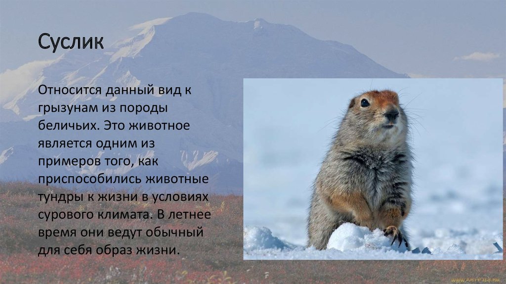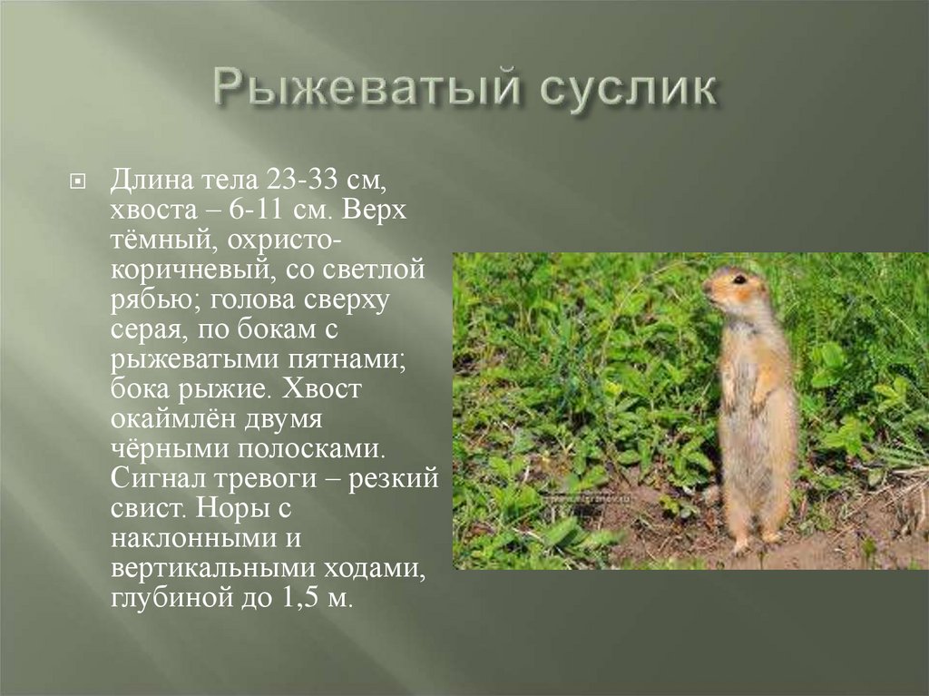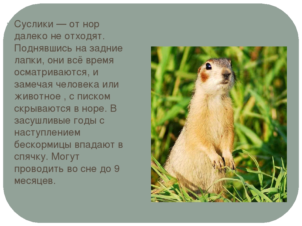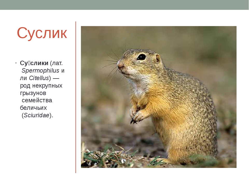 Суслик является животным млекопитающим, относящееся к семейству белок, которые принадлежат отряду грызунов (куда так же входят ондатра и полевая мышь). Это небольшие зверьки 17-27 см, весом до полутора кг. Довольно социальные животные, проживают в норах, общаются при помощи свиста или шипения. В холодную зиму или сухое лето впадают в спячку, за что получили кличку «Сони».