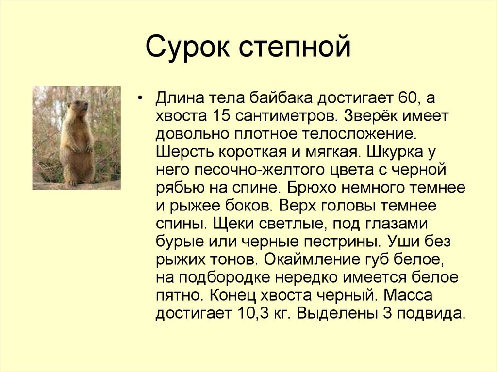 Вес суслика от двухсот граммов до полутора килограммов, в длину его тело около пятнадцати сантиметров. Большинство сусликов имеют серо-коричневый окрас, что очень подходит для маскировки. На мордочке видны торчащие зубы при помощи которых, грызун роет норы не глотая землю.