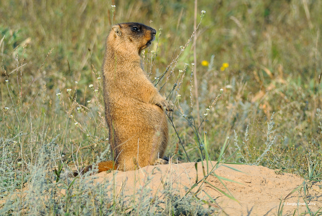 На дежурстве всегда поставлен один из стаи, на фото животного суслика можно увидеть как он, стоит вытянувшись на посту.
