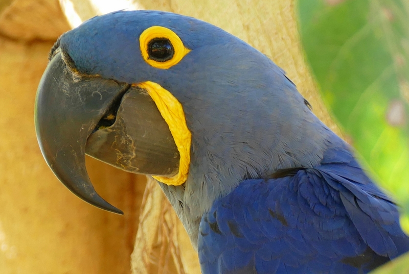 У гиацинтового ары ара потрясающий кобальтовый цвет по всему телу, с ярко-желтым кольцом вокруг глаза и таким же желтым цветом у основания и в углах клюва.