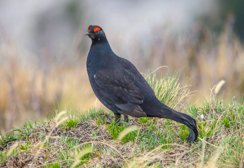 У тетеревов красный аптерий, сплошной черный хвост и буровато-серые перья на теле. Он также отображается на земле.